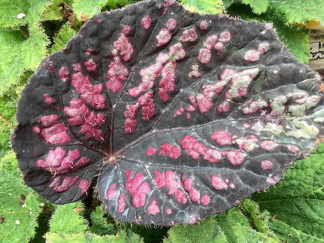 Begonia Pandora is a striking rex begonia. The leaves are red to pink with dark veins and markings.